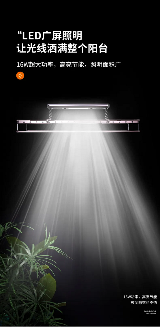 时尚广屏LED灯照明,灯光光线柔和不刺眼,16W超大功率,高亮节能,照明面积可以覆盖大多数居家阳台,夜间晾衣也不怕,照亮阳台各个角落。