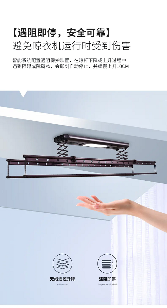 本机智能系统配置遇阻保护装置,在晾杆下降或上升过程中遇到阻碍或障碍物,会即刻自动停止,并缓慢上升10cm,避免晾衣机运行时家人受到伤害,保护家人安全。