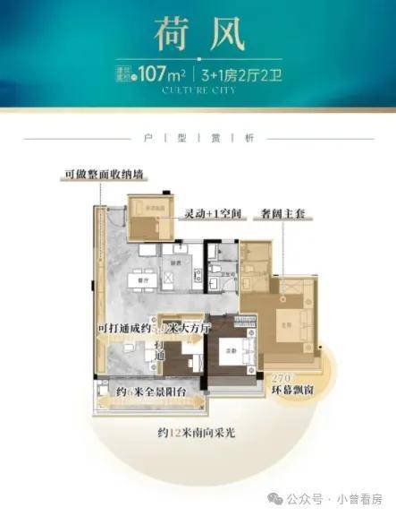 130㎡四房两厅两卫总价约 520 万起,南北通透,双阳台设计,观景阳台 6.8 米,生活阳台 3.2 米,能兼顾休闲和实用,长辈房带飘窗,适合三代同堂居住。