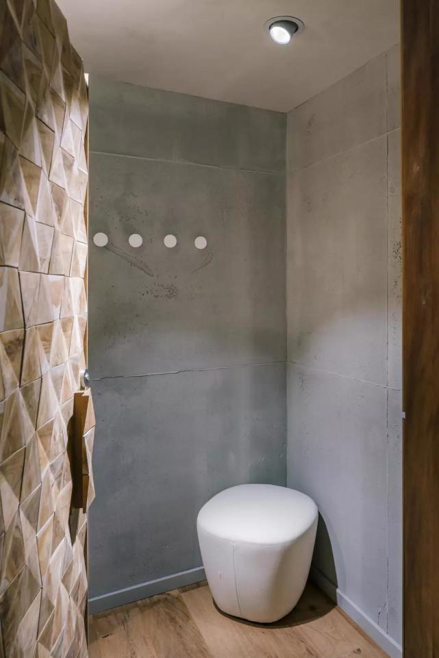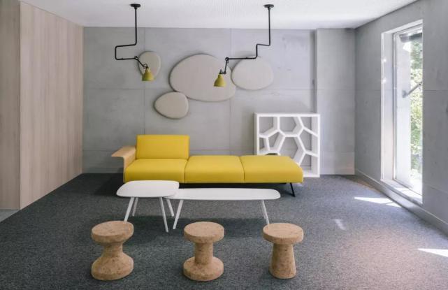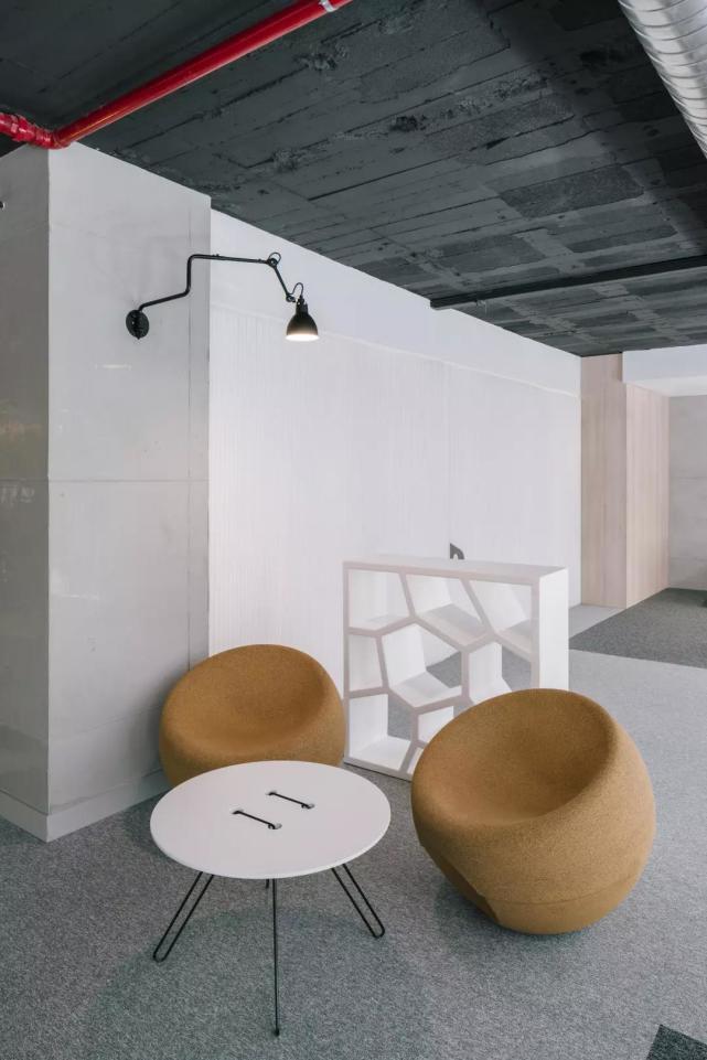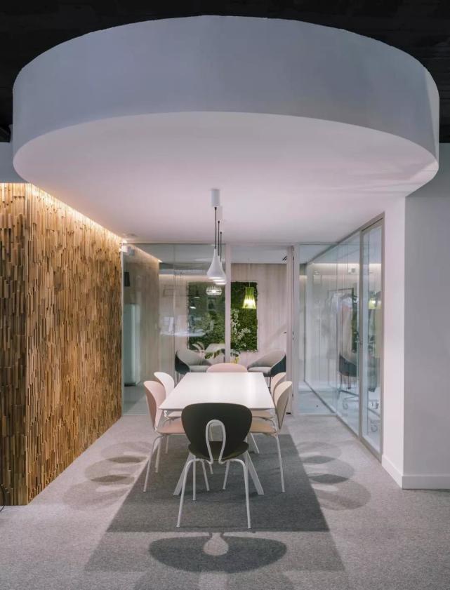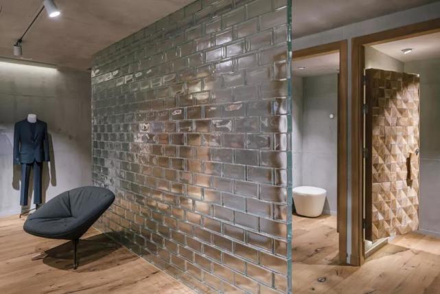 除此之外,设计师在材料的选择上非常注重可持续发展的概念,比如一层空间的天花板全部采用了回收的木材,并沿空间纵向铺设,独特的造型营造出别具一格的肌理效果;厚实的玻璃砖墙构成的隔断轻盈柔美,植物的引入更是增添了室内绿色盎然的生气。这些材料都是构成空间的核心元素,在突出空间主体的同时也丰富的整个设计的灵魂。