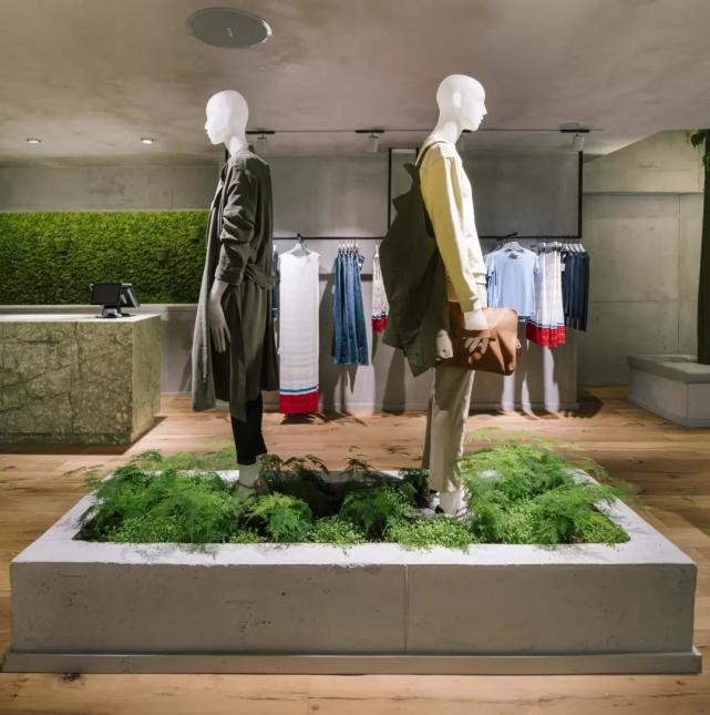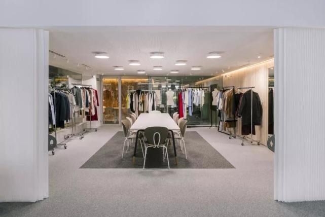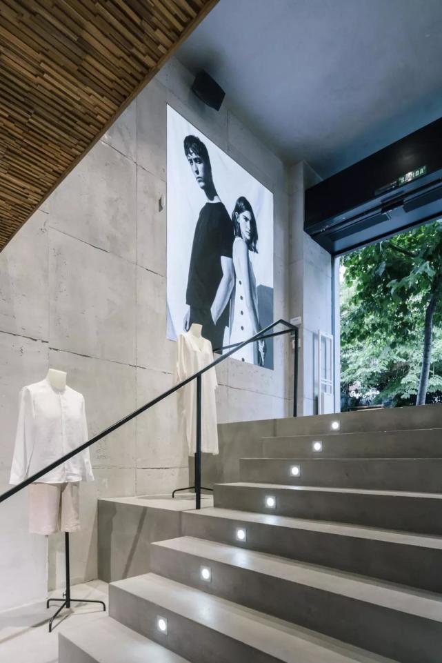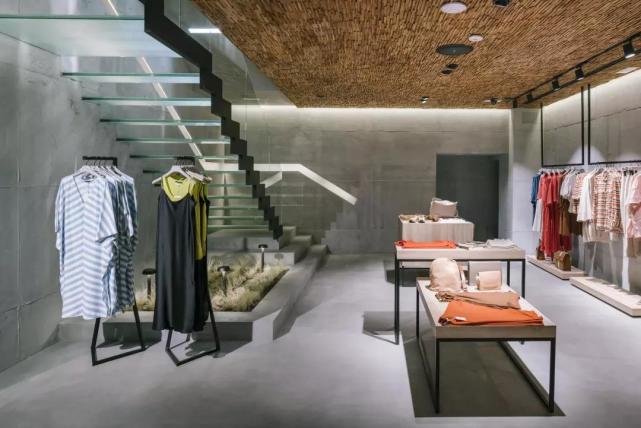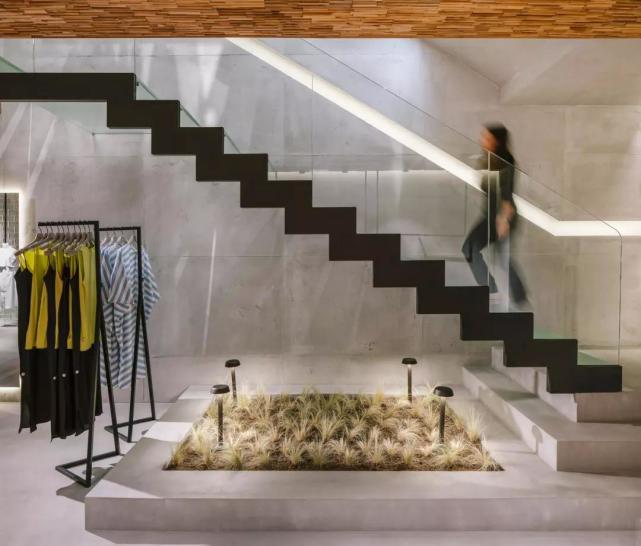 由于店铺的一层是下沉式空间,入口处设有台阶,当顾客走进店内,可以站在一个相对高的位置,同时看到上下两层的服饰商品。楼梯被设置在靠后的区域,这样可以保证销售空间的统一性和连贯性。店内所有的商品都以纵向方式整齐地排列,在视觉上延伸了空间的深度。