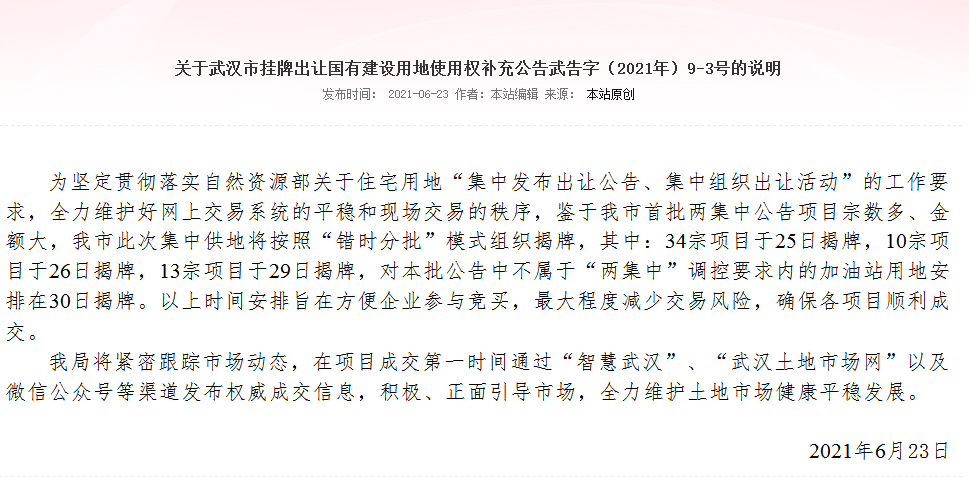 据武汉土地市场网公布信息,武汉首次“两集中”供地将分三天竞拍,按照“错时分批”模式组织揭牌,其中34宗项目于25日揭牌,10宗项目于26日揭牌,13宗项目于29日揭牌,对本批公告中不属于“两集中”调控要求内的加油站用地安排在30日揭牌。 除此之外,根据《武汉市挂牌出让国有建设用地使用权补充公告武告字