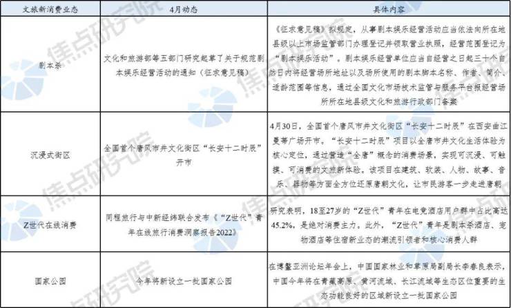 引言 :4月,文化和旅游部等六部门联合印发《关于推动文化产业赋能乡村振兴的意见》,从顶层设计层面为更好地建设乡村文化、经济共同体指明了方向。《关于进一步调整暂退旅游服务质量保证金相关政策的通知》则提及“旅行社可全额暂退保证金或暂缓交纳,补足保证金期限延至2023年3月31日”,致力于为旅行社行业进一步纾困。文旅新消费方面,为规范“剧本杀”“密室逃脱”等剧本娱乐经营活动,文化和旅游部等五部门研究起草了《关于规范剧本娱乐经营活动的通知(征求意见稿)》,拟规定剧本娱乐经营单位应当坚持正确导向、建立内容自审制度、确保内容合法等。全国排名前列沉浸式唐风市井生活体验街区“长安十二时辰”本月在西安正式亮相,以“全业态、全场景、全时段”的商业模式为城市文旅商业深度赋能。同程旅行与中新经纬本月联合发布《“Z世代”青年在线旅行消费洞察报告2022》,指出“Z世代”青年在旅行消费多元化方面正在发挥着越来越大的影响力,逐渐成为新消费潮流的引领者。