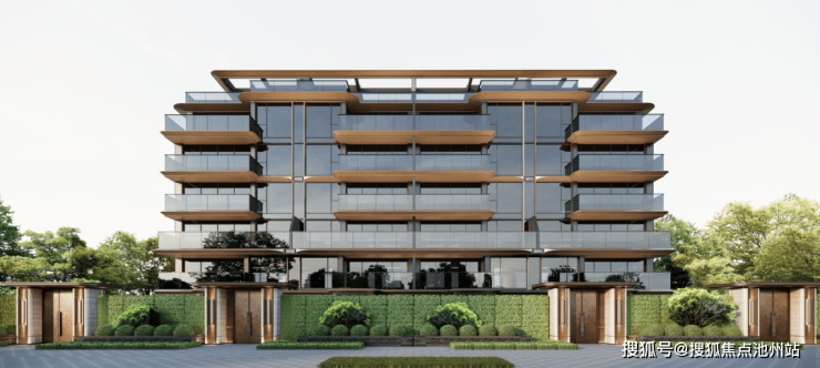 项目以“瓯江帆影”为灵感,延续天樾玺“千年商港,百帆竞发”的温商精神,整体采用大面积玻璃铺陈,搭配局部香槟色铝板勾勒线条,连女儿墙都特意采用香槟色格栅点缀美化。