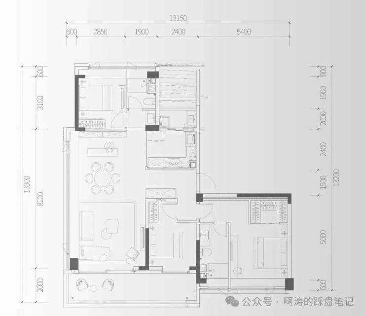B户型建面约134㎡三房两厅两卫,南北对流,约6.8m超宽景观阳台,主卧套房,阳光化妆间,独立长辈房,动静分区。