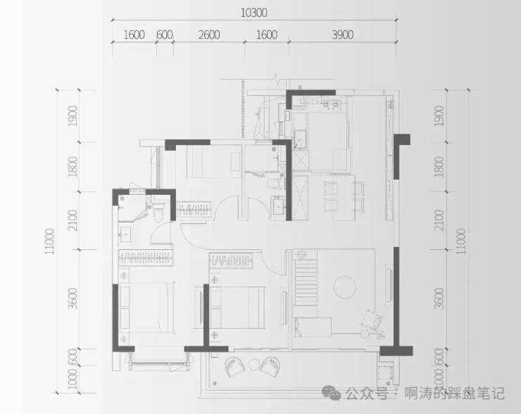 A户型建面约110㎡三房两厅两卫,约6.9m巨幕景观阳台,三开间朝南,独立主套房,带全明大飘窗。