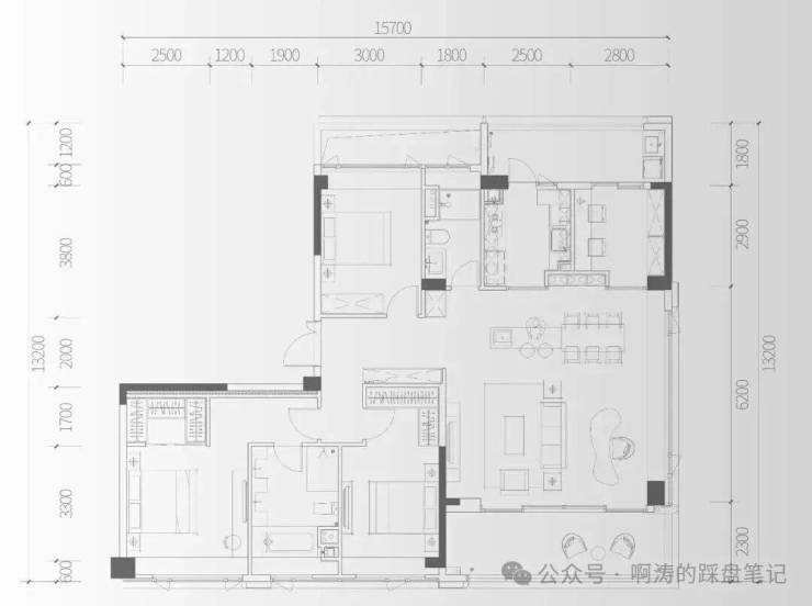 D2户型建面约174㎡四房两厅两卫,一梯一户,私家候梯厅,纯板式设计,南北对流,独立主套 多功能客厅,270°约6.6m+8.5m环幕IMAX景观面。
