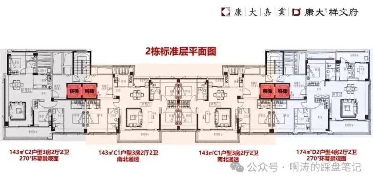 C1户型建面约143㎡三房两厅两卫,约6.6m巨幕景观阳台,一梯一户,私家候梯厅,纯板式设计南北对流,独立主套,多功能客厅。