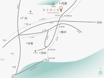项目位于广东省河源市源城区埔前镇陂角村,距离河源市区车程约半个小时,距离广州市区约187公里,距离深圳市区约162公里,项目紧邻长深高速、广河高速与河源东站(广河高铁与赣深高铁),自驾车程时间2小时内到达,2021年12月10日赣深高铁全线通车(通车后香港西九龙至河源东站仅1小时),项目完全融入粤港澳大湾区1小时经济生活圈,区位整体通达性较高,距离时长适宜周末家庭短途出游度假。