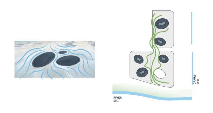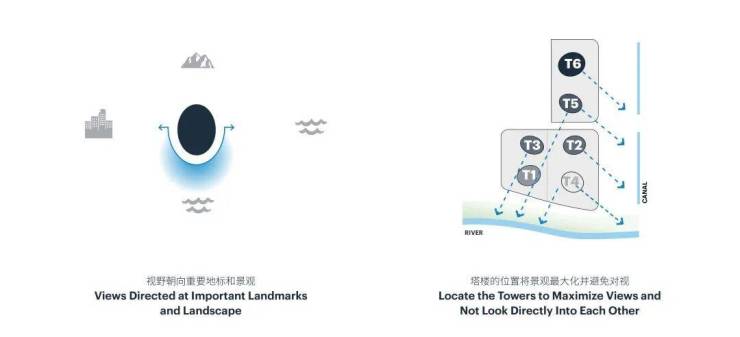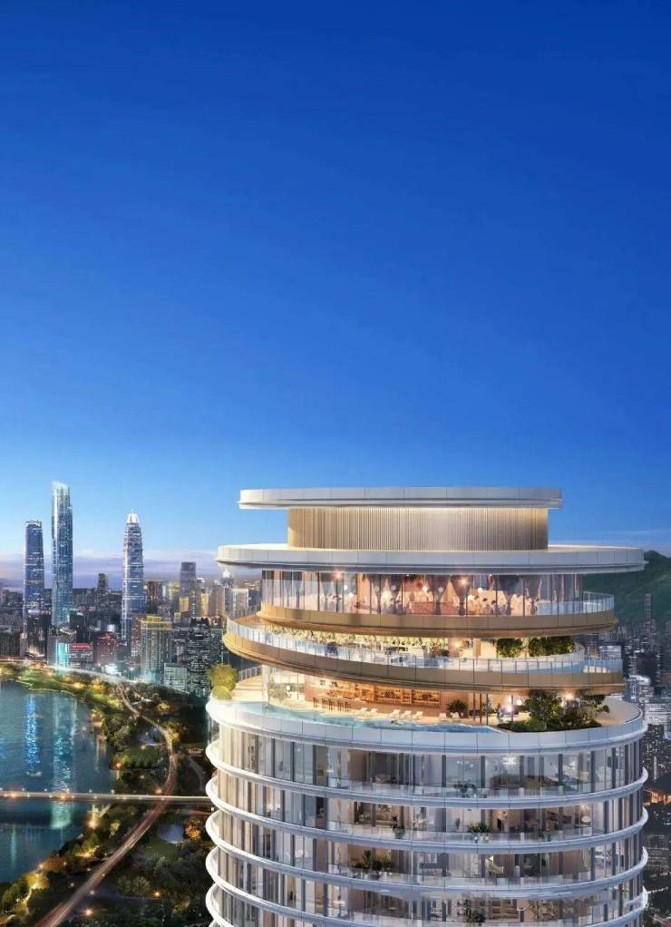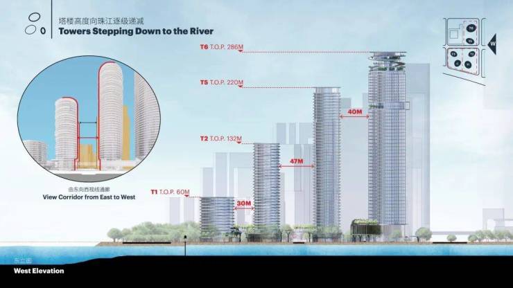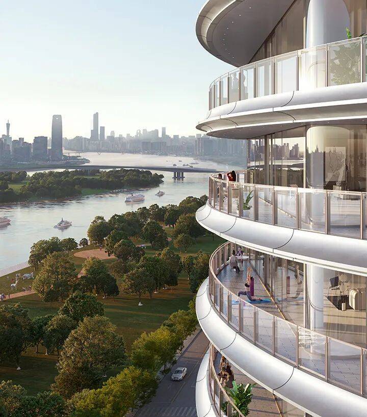 塔楼随着与水域的距离增加而逐渐升高,全景视野覆盖广州市中心、珠江和周围自然景观。最高的塔楼设有多层配套设施空间,包括餐饮、无边泳池、水疗中心和观景平台。
