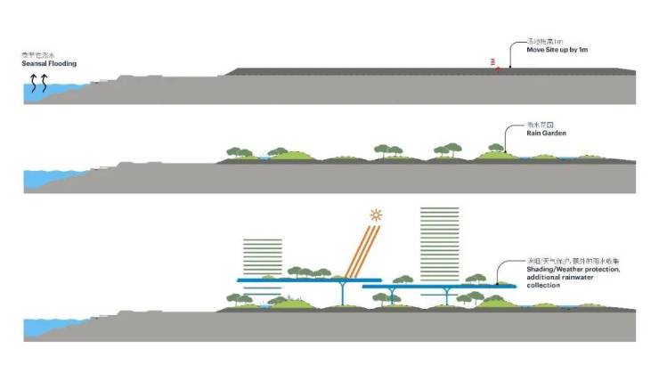 该项目的设计策略融入了海绵城市等理念,包括透水铺装、本土植被,以及创新的雨水管理系统,以应对该地气候环境所带来的洪涝挑战。建筑物置于抬升的景观之中,配有蜿蜒迂回的步行道、水景和植被。