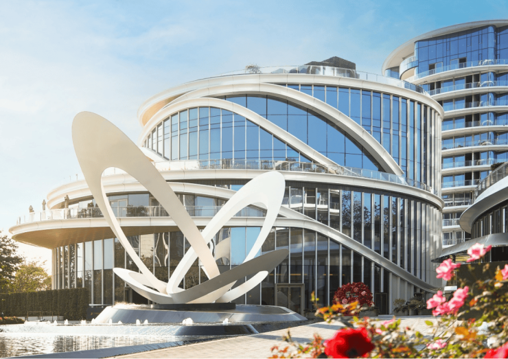 建筑采用椭圆形造型,与河流的蜿蜒流向相呼应。每栋建筑随着靠近水面逐渐降低高度,视野也随之优化,可以欣赏到河流和周边其他景点的景致。最高塔楼的顶部是一个多层的配套空间,内设餐饮场所、健身房、无边际泳池、水疗中心以及酒店大堂。每层楼都设有阳台,可一览河畔美景。