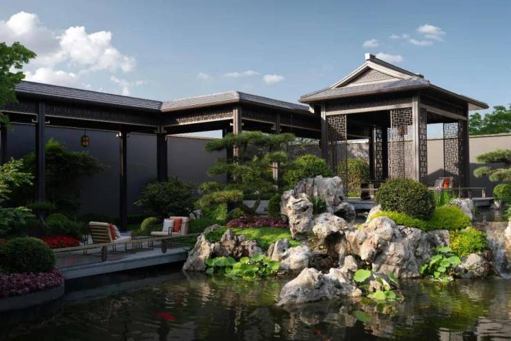 在会所中央,设计了充满中式韵味的四水归堂:屋檐四面围合,中间种植舒展松树,承载着中国传统文化中“天人合一”的理学思想。雨季时节,水从四面的檐壁汇聚,寓意着财源风水,也寄托着家人团圆的美好愿望。