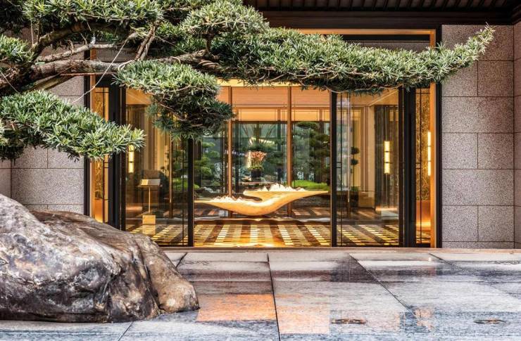 建筑设计出自gad手笔,立面以浅灰石材、咖啡色铝板、涂料为主,主打一个“水墨淡彩”,悬山顶出檐深远、举折平缓。并以简洁金属线条勾勒,将悬鱼、雀替、花窗等元素进行抽象化表达,尽显中式隽永之美。尤其是立面用的铝构工艺,工序繁复,线条立挺,专门邀请古建筑施工单位打造。