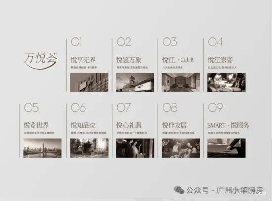 内部「万悦荟」整合多元业务领域,联手行业领先国际品牌,为业主带来系统化、定制化的全新滨江万象生活方式,包括:悦享无界、悦鉴万象、悦江·CLUB、悦江家宴、悦览世界、悦知品位、悦心礼遇、悦伴友居、SMART·悦服务9大权益。
