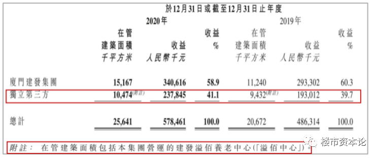数据显示,2020年,建发物业来自独立第三方的物业管理服务在管建筑面积为1047.4万平方米,占比41%,其中包含了建发物业集团运营的建发溢佰养老中心。