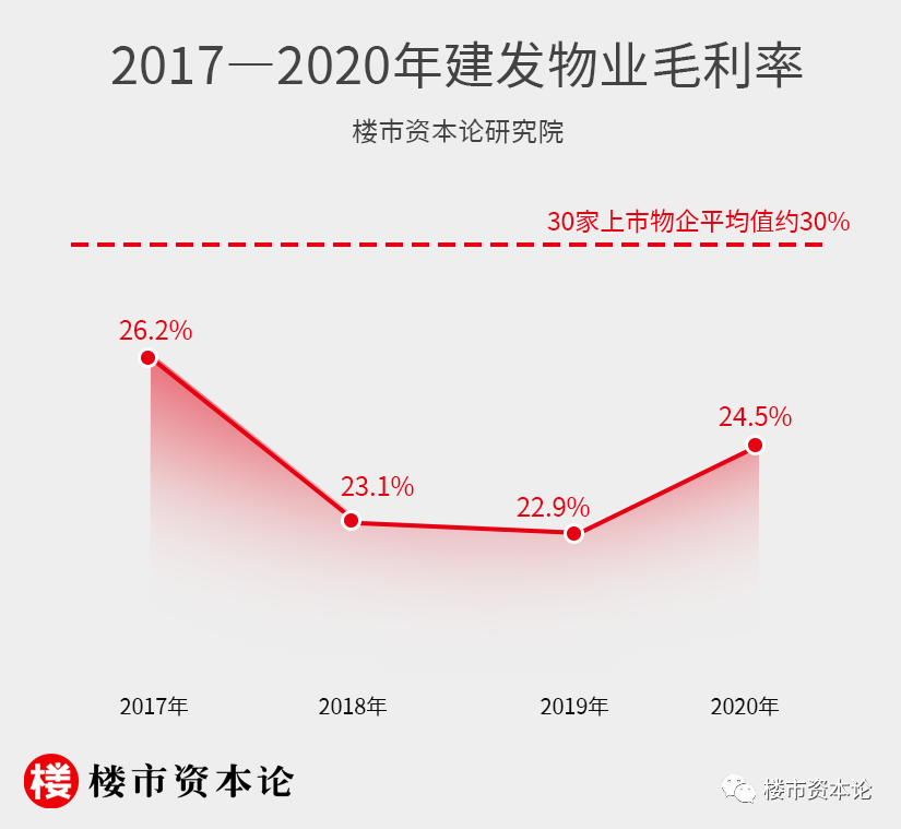 2017年至2020年,建发物业的毛利率分别为26.2%、23.1%、22.9%、24.5%,低于上市物企约30%的平均值。