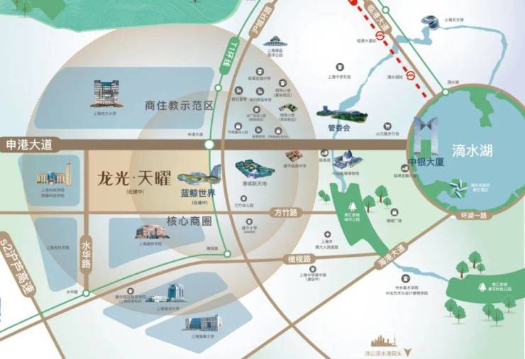 【龙光·天曜】就位于商住教示范区的门户核心位置,从上海市区自驾来临港,经S2沪芦高速(已全程免费)下闸道进入申港大道,首先映入眼帘的就会是滴水湖首个天际坐标——龙光蓝鲸世界百米酒店。这个酒店也是【龙光天曜】建面约50万方综合住区的商业配套部分。