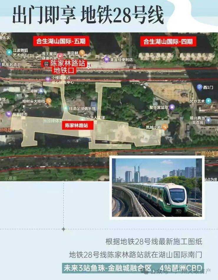 如果选择地铁出行,有规划中的28号线的陈家林路站,距离项目大概只有900米左右,目前规划站点在合生湖山国际那边,但还是存在一定的不确定性,地铁建好开通以后,坐地铁去天河、海珠、黄埔等区也非常方便。