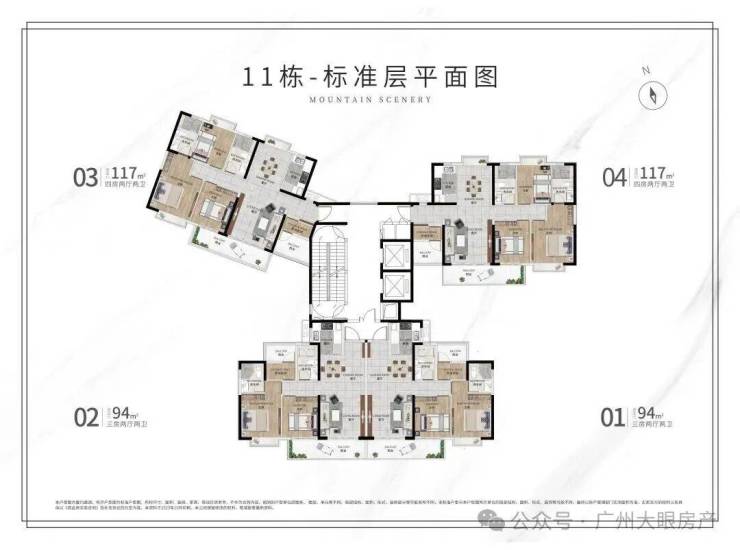 以山景为依托,半围合式布局,每一栋高层朝向皆不同,前后无遮挡,每一户的景色都是独一无二。