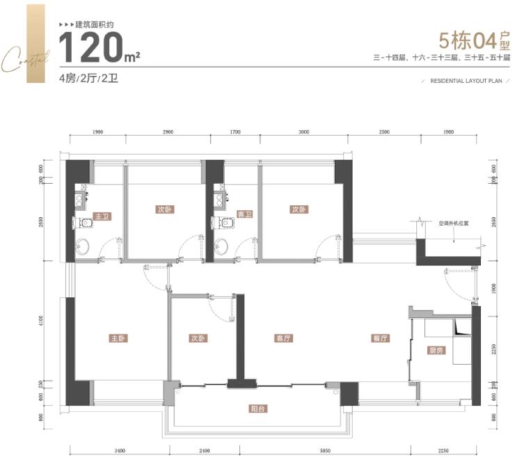 建筑面积约143㎡的4房2卫,同样是大横厅的设计,通透采光。客餐厅约7.05米开间,横厅设计,客厅直连观景阳台,餐厅有飘窗,通风采光优越;超7米大开间观景阳台,客厅和次卧阳台直连,极致观景面;主卧超级大衣帽间和卫生间,阔绰舒适主人房;双阳台多飘窗,提高室内使用率。