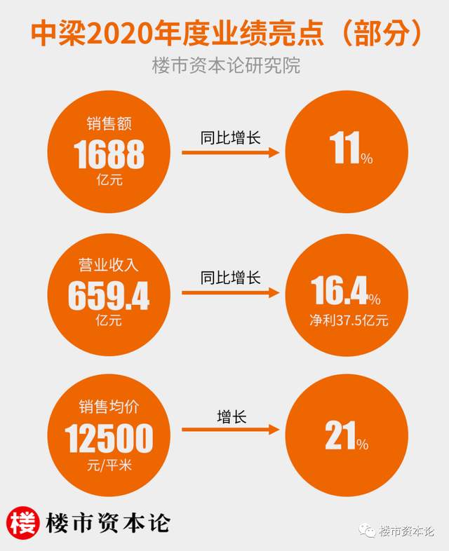 截至2020年底,中梁以1688亿元,完成当年增长11%的销售目标,销售稳居TOP20。营业收入659.4亿元,同比增长16.4%,其中净利润37.5亿元。必须要提的是,2020年中梁的销售均价为12500元/平米,增长21%,与普遍下滑的同行相比,殊为难得。