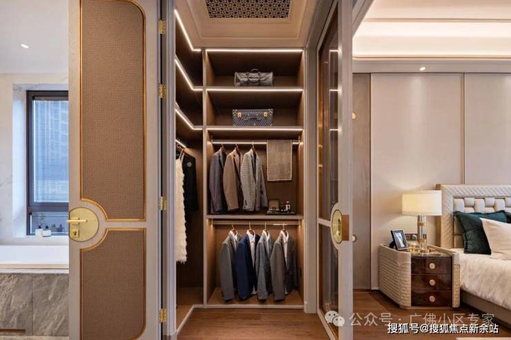 ✨时尚衣帽间采用扪皮、玫瑰金金属外框、夹丝玻璃搭配设计,超大空间满足男女主人放置衣物饰品的需求;
