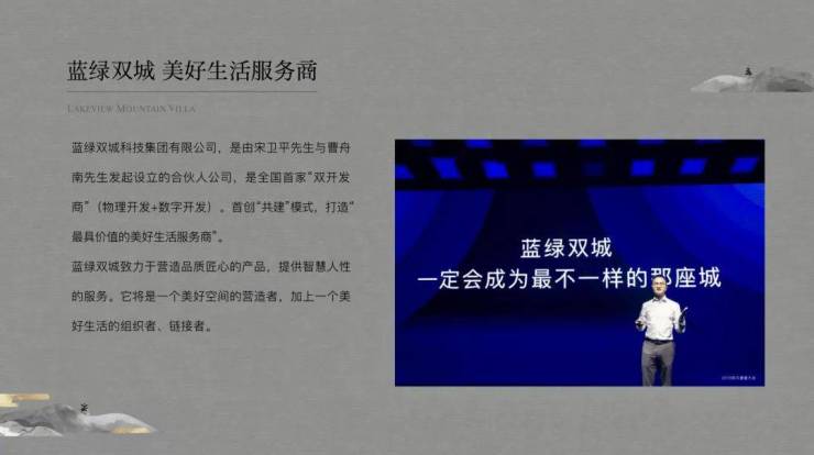 蓝绿双城是由宋卫平先生与曹舟南先生发起设立的合伙人公司,是全国首家“双开发商”(物理开发+数字开发)。蓝绿双城公司传承宋卫平先生27年一直倡导的价值理念和品质精髓,首创“共建”模式。