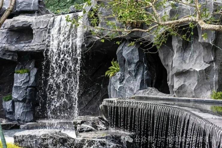 曲径通幽、巨石相依、劲松挺立、层层跌水,遥见如山间瀑布。