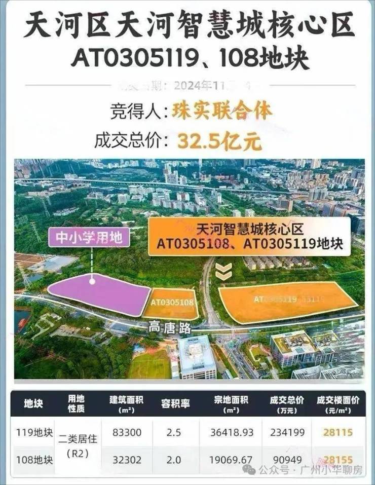 2024年11月14日,珠实联合体底价拿下天河智慧城地块,成交总价32.5亿元。