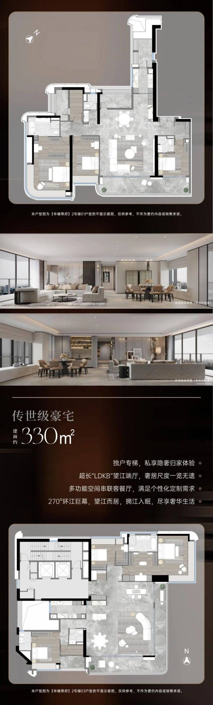 项目主推建面约 248 - 330㎡天际大平层,每一款户型都经过精心雕琢,尽显奢华与大气。248㎡户型,四开间朝南,双阳台设计巧妙,东南向采光充足,让阳光与清风自由穿梭于室内。主卧套间配置独立卫浴,为主人打造私密、舒适的专属空间,尽享尊崇生活。253㎡户型,五开间朝南,拥有 270°环幕阳台,将窗外美景尽收眼底。LDKB 一体化空间布局,打破了传统空间的界限,让客厅、餐厅、厨房和阳台形成一个开阔、通透的整体,增强了家庭成员之间的互动与交流,营造出温馨、和谐的居住氛围。330㎡户型更是独具匠心,端厅设计搭配 270°江景视野,将珠江支流的壮丽景色与琶洲 CBD 的繁华天际线完美融合。主卧配备 270°飘窗,不仅增加了室内的采光和通风效果,更让主人躺在床上就能欣赏到绝美的风景,奢享极致的私密性与舒适度。全系四房设计,专梯入户,南北通透,为居住者提供了无与伦比的居住体验。