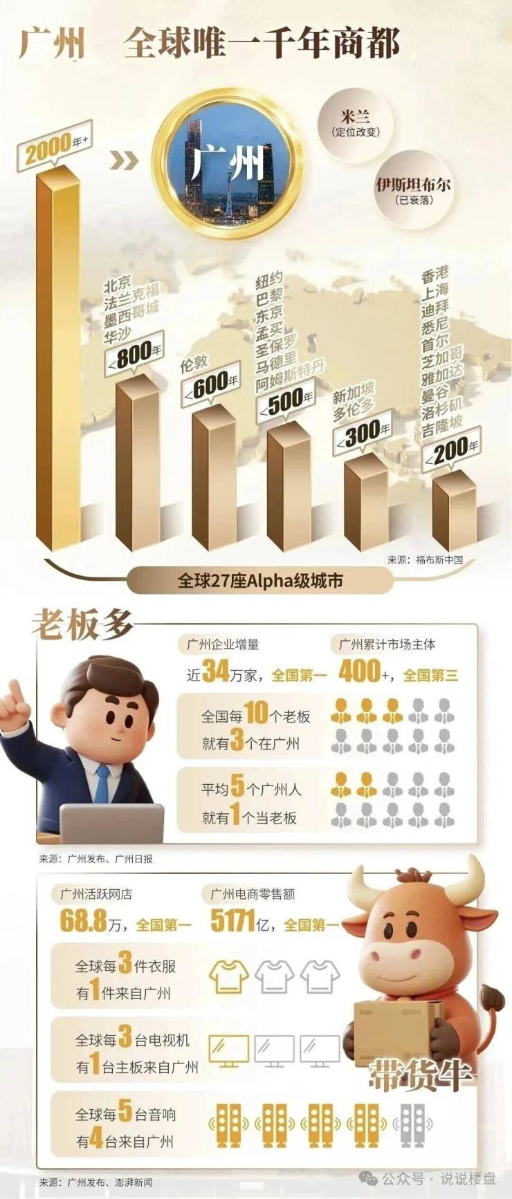 全球27座Alpha级城市,只有广州,能称为「千年商都」,2000多年,出海通商从未间断,时至今日羊城仍是商贸顶流,每5个广州人就有1个做生意。每天还能新增580个“小老板”(个体工商户),带货能力,全国领先,广州制造,卖遍全球!