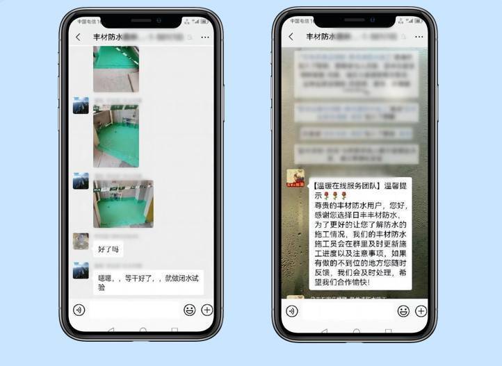 消费者购买丰材防水后,会有专业人员上门提供施工服务,同时会建立施工沟通群(一户一群)。在施工过程中,施工人员会上传施工照片,消费者可以在群中实时查看施工现场图,掌握施工情况,与施工人员直接沟通,各种疑问亦可随时获得专业解答!