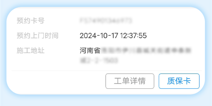 除此以外,消费者还可以关注丰材防水微信公众号,使用绑定手机号/预约卡来便捷地查询工单和质保单,或者通过点击丰材防水服务短信链接一键直达工单页面,同样能够看到施工场景图,了解到最详细的施工进度。