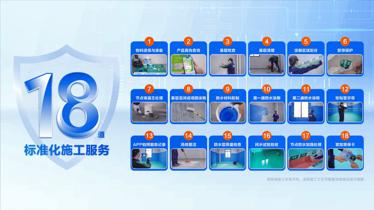 从品牌建立之初到今天,丰材防水一直追求服务专业、标准、透明。丰材防水18道标准化施工服务,每道工序都有据可依。