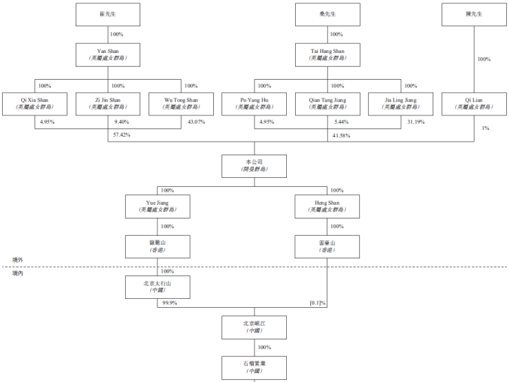 上市主体名称被包装成石榴投资集团,石榴置业变身为其在境内的少有平台。招股书显示,创始人、董事长崔巍持股石榴投资集团57.42%,总裁桑春华持股41.58%,两人合计持股99%。