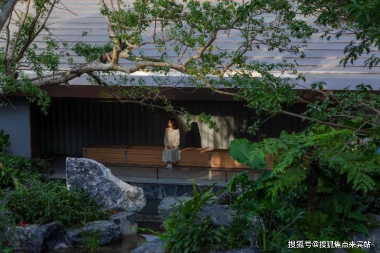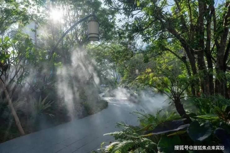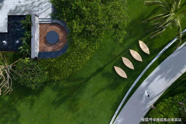 当我们第一次踏足这里的时候,清水湾的绵长沙滩和山海间的情愫深深地吸引着我们,路旁成片的槟榔林与林后的村落给我们留下了很深刻的印象,于是便有了一个隐藏在一片热带棕林背后的住区入口、雨雾弥漫的热带雨林、阳光透过的成片椰林、草阶模仿出海浪等等体现海南当地地域特征的空间设计。