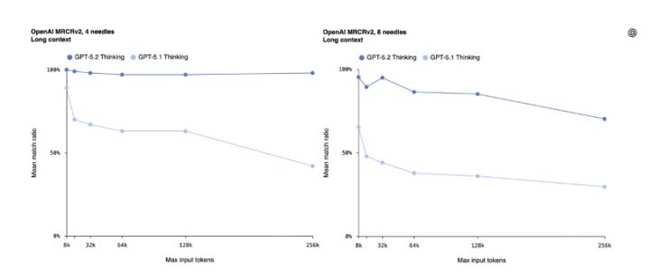 长文本推理与视觉理解能力的升级同样值得关注。在MRCRv2基准测试中,GPT-5.2对数十万token跨文档信息的整合准确率远超前代,尤其在256k token上下文的多“针”识别测试中接近100%准确率,可高效处理百页级报告、合同、学术论文等超长文本。