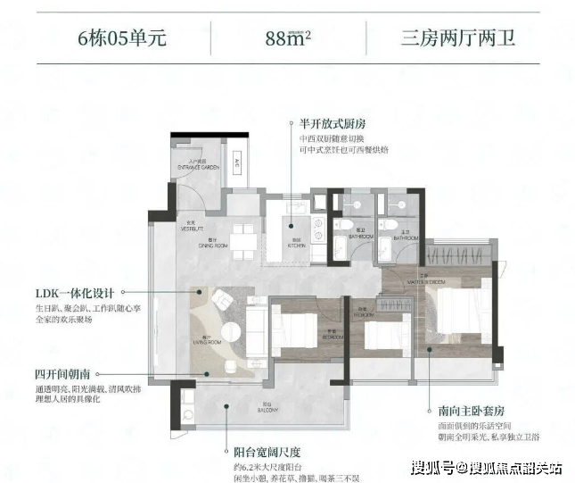 深入室内空间,户型设计是该项目最具竞争力的板块之一。首期主推的建面约88平方米三房和106平方米四房,均严格遵循了最新的建筑设计规范。以88平方米的户型为例,其阳台开间达到了约6.2米,而105平方米户型的阳台开间更是延伸至约6.5米,125平方米户型则达到了惊人的8.3米。这种宽景阳台的设计,不仅拓展了室内的视觉延伸感,也为居民提供了更多的生活场景可能性,如种植花草、摆放休闲桌椅等。此外,所有户型均配备了入户花园,各个卧室也设计了超大飘窗,这些不计入产权面积的空间极大地提升了实际使用率,使得得房率基本超过100%。这种对空间极致利用的做法,在同面积段的产品中确实不多见,尤其适合对房间数量和功能分区有明确要求的家庭。