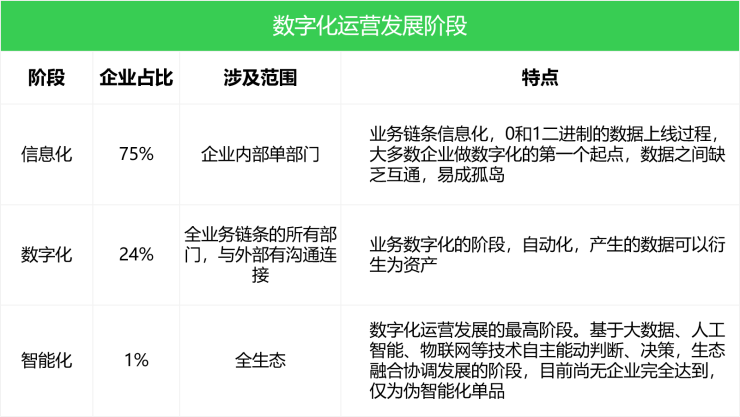 从调研结果来看,目前行业内大多数企业的数字化运营仍处于数据上线的“信息化阶段”。在处理能力、响应速度、解决问题等方面距离真正意义上的“智能化”道阻且长。