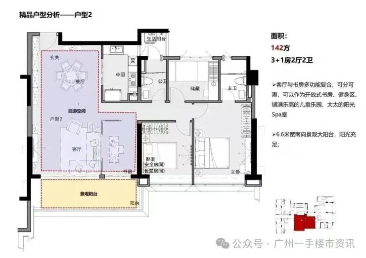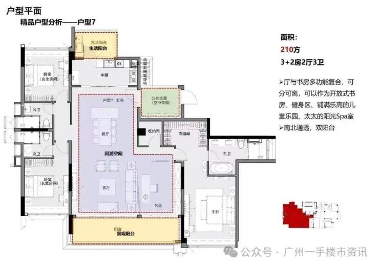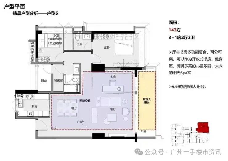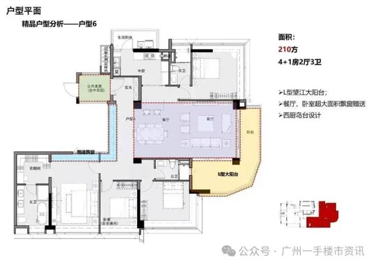 整个保利阅江台项目分为低区和高区,低区5-18层是两梯五户的设计,户型涵盖121-143㎡三至四房;高区20-30层则是两梯两户的设计,户型为208-210㎡的大平层四房产品,整个项目住宅总共仅92户稀缺单位,产品户型主要面向市中心改善型客户群体。
