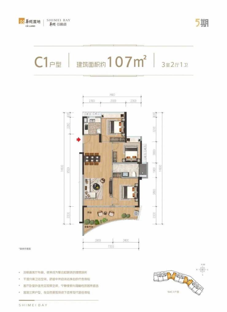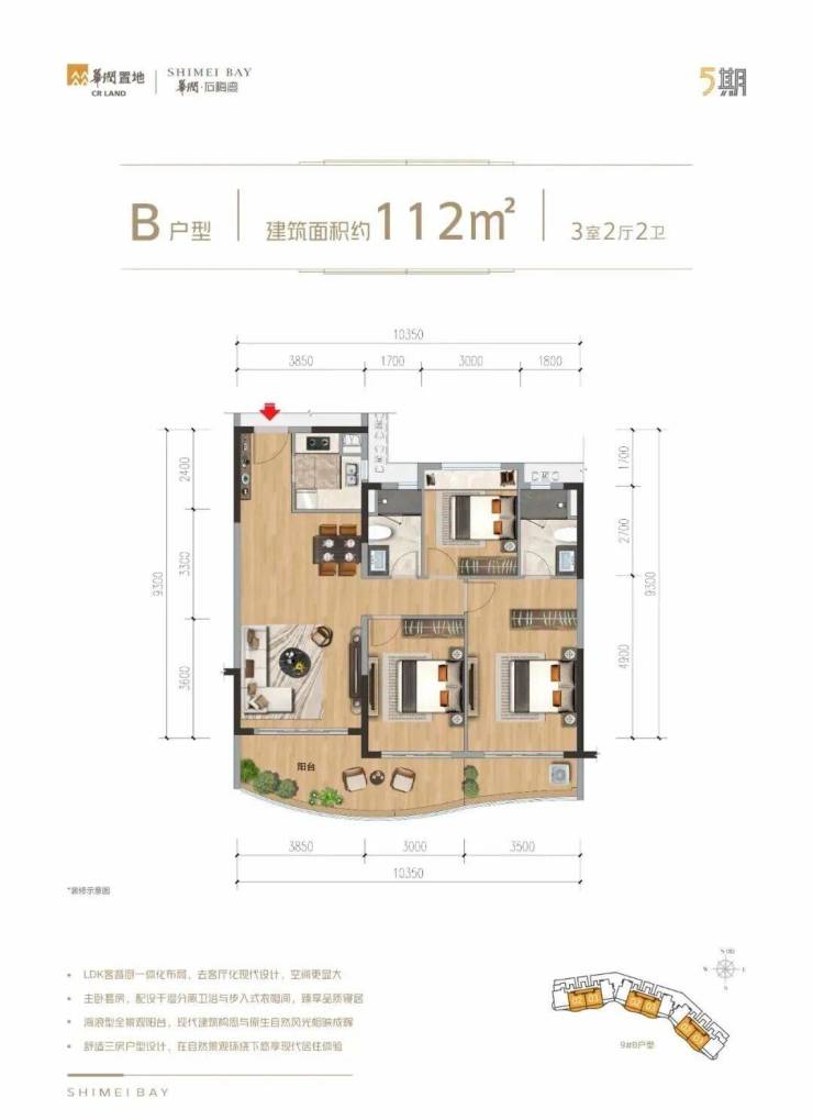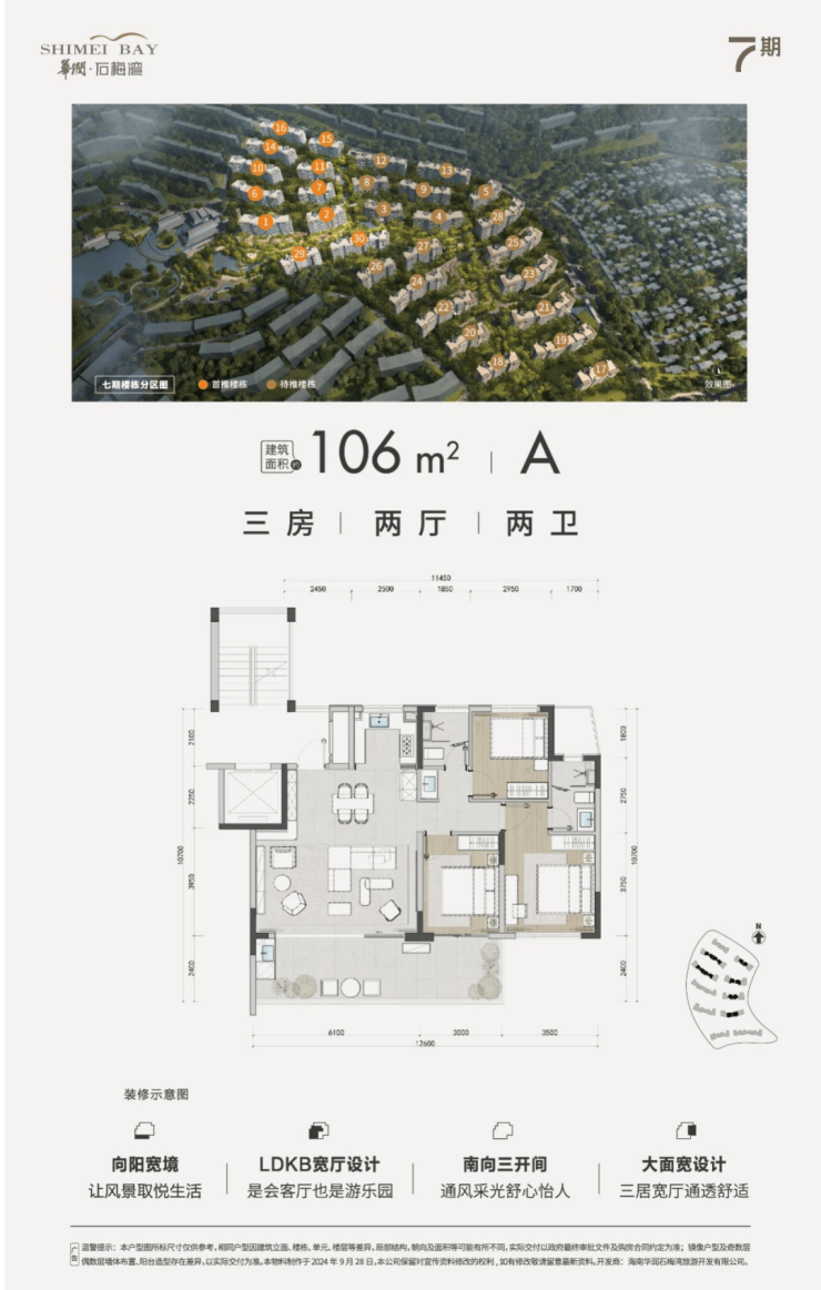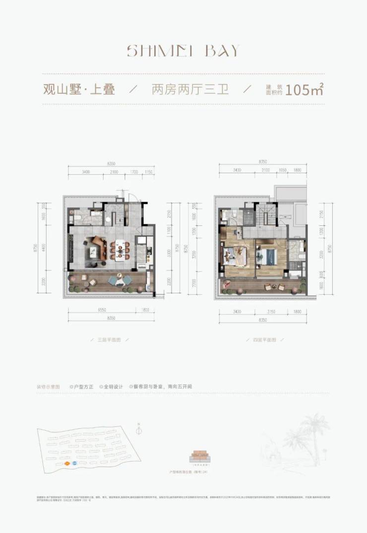 |建筑面积约105㎡○三卫设计,舒适起居,生活自在不拥挤○户型方正,全明设计,纵览山海风景○LDKB专享度假感格局,丰富生活层次○餐客厨与卧室,南向三开间,阳光满室○套房式主卧,约8.4m朗阔阳台,环瞰山海