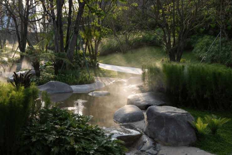 狭长的雨林戏水区融合生态、亲子、戏水等功能,呈现出浓郁的丛林感溪谷玩乐空间。儿童戏水的溪谷沿岸是自然置石,岸边散铺鹅卵石,池底嵌入自然片石,以最自然的方式处理了高差,也给孩子们带来最本真的欢乐。