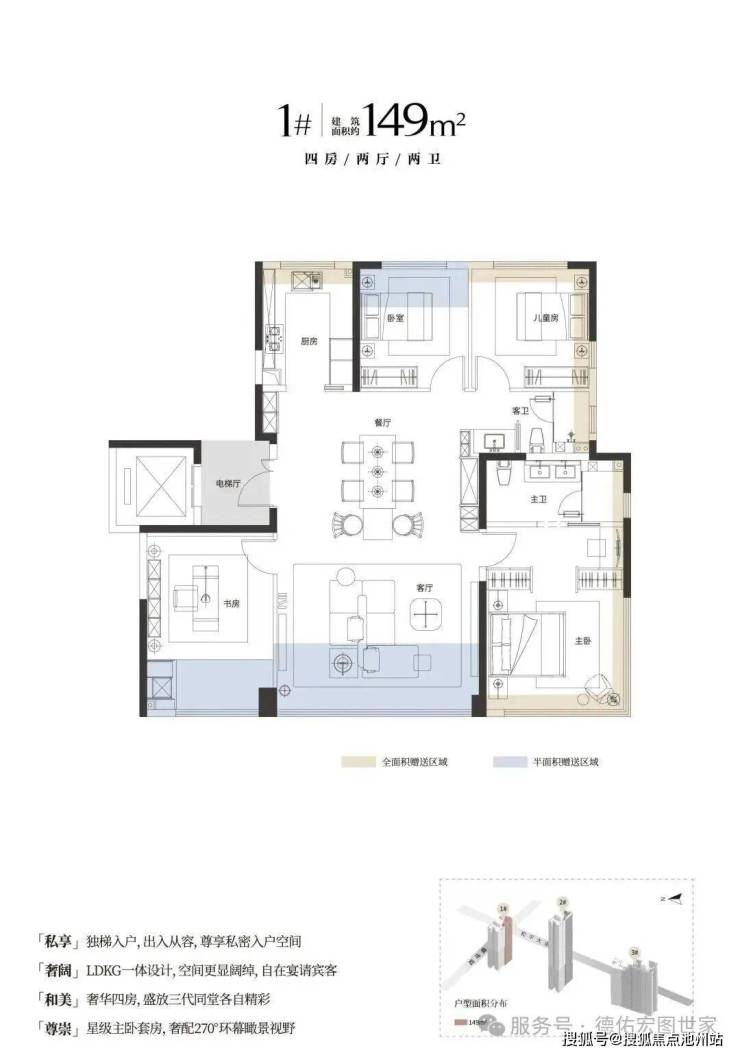 该户型为1号楼东边户,临和平大道,南北通透,三面采光,三开间朝南。该户型带独立电梯前室,南北三个阳台,均可优化一半空间;除带阳台房间外,其它房间均有飘窗空间拓展,其中,南向主卧和北向儿童房还能做到双面飘窗优化。该户型是“类四叶草”结构,走道面积少,不过动静分区不佳。