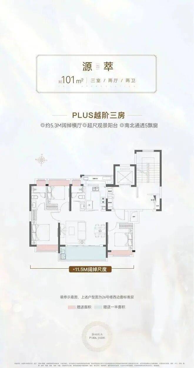 经典飞机户型+三开间朝南+餐客厨一体化+约5.3m的阔绰横厅,整体南向面宽达到约11.5m!整个户型的通透度和采光度很棒。