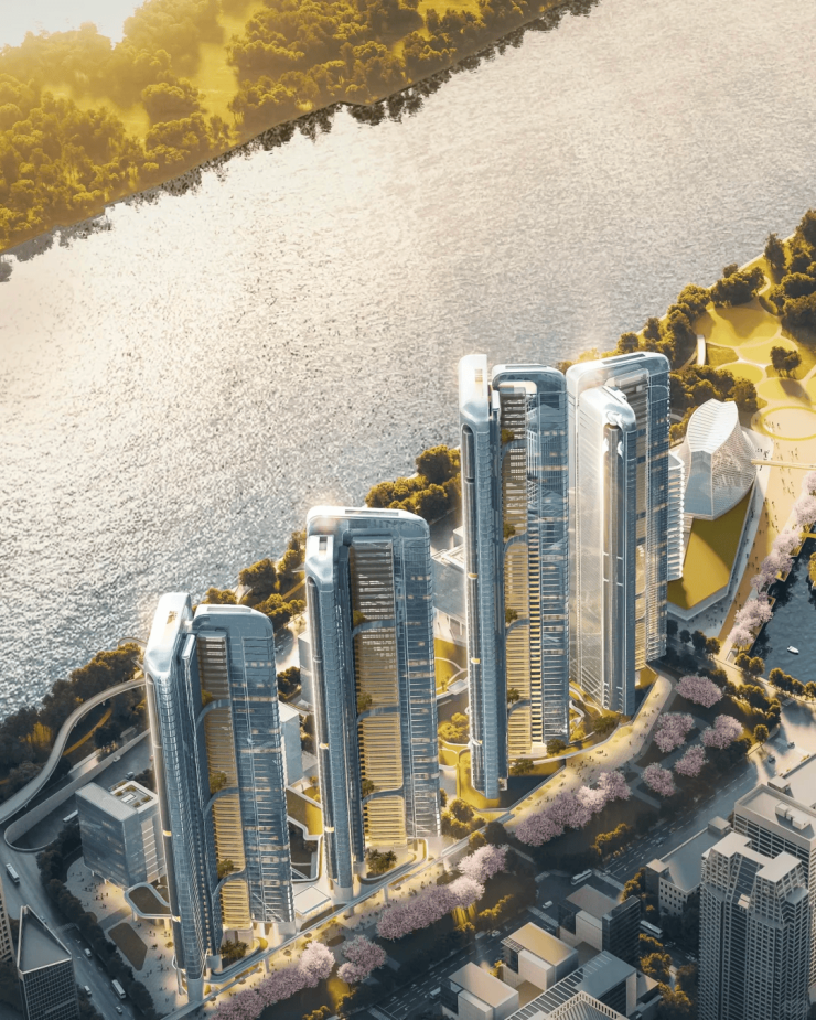 首期主要由两座分别楼高50层,总建筑高度210.3米以及楼高48层,总建筑高度202.5米的商业大楼组成,另在江边有两座矮座总部办公大楼。