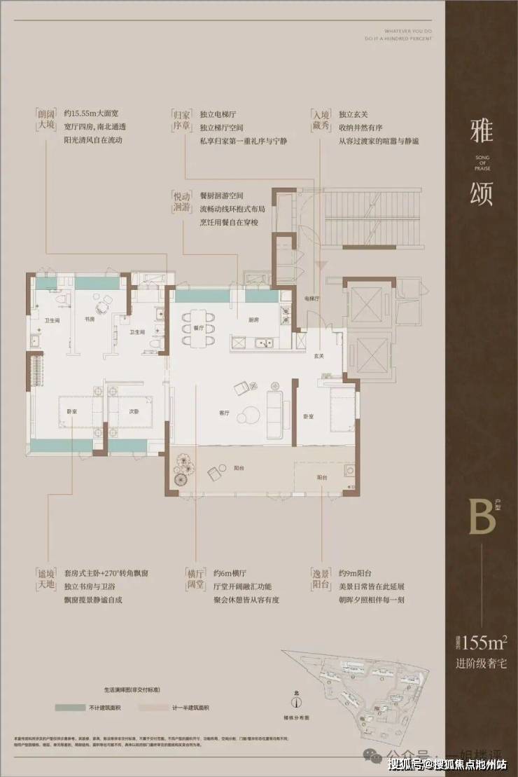刚刚,项目首批户型图发布,虽然都是建面约155平的四房,不过一个是全景舱户型,一个是四开间朝南的户型,均带有独立电梯前室。先来看A户型建面约155平四房,分布在2号楼小高层中,以及3号楼的东边。这个户型做了两开间朝南,主卧套房以及一个次卧朝南,次卧通过南向转角阳台优化面积;客厅则是270°的全景舱设计,带来较大的转角阳台,全封窗。户型的北向是另外一个次卧和书房,其中书房双面飘窗优化面积,次卧、厨卫均带有飘窗。