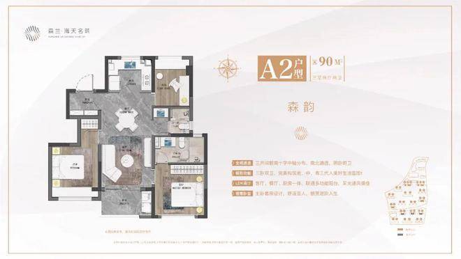 1、建面约90㎡做到了三房两卫,构筑老、中、青三代人美好生活蓝图。格局上实现了真正的全明空间与南北通透,客厅、餐厅、厨房一体,联通多功能阳台,采光通风俱佳。