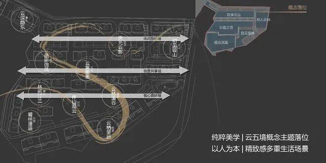 以三条景观归家轴线(休闲放松轴、邻里共享轴、核心森林轴)、五个云中之境(初入云林、登云望林、观云流溪、云庭之境、隐享云山)、十个精致生活花园(初见云山、云林溪谷、云栖望远、伴山观云、林闲汀兰、晴林漫道、疏影微风、云雾雅集、天光云影、云深隐乐)为整体园林布局,构建精致感多重生活场景。同时以三级绿廊步道(快速归家动线、景观归家动线、场地游园小径)串联整个园区,景观节点延步道分散排布,做到楼楼是核心,栋栋有花园。