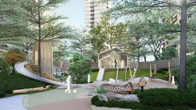 林荫儿童游戏场,采用生态材料布置圆木桩、森林穿梭、树屋主题器械等设施,丰富的植被体系、自然环保的砾石铺设,让孩子们能更安心舒适的在自然中协作与冒险。穿梭与林下,与自然相契合,多形态的灌木形式、自然堆叠的原木设施,建造一片承载着欢声笑语、释放天性的童趣世界。